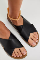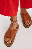 Spanish-made faux snakeskin sandals featuring wide crisscross straps and a contoured footbed.