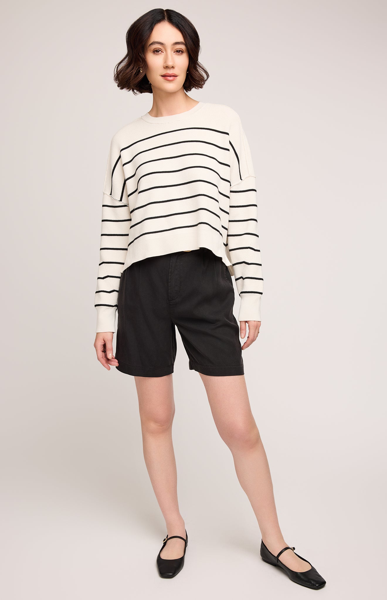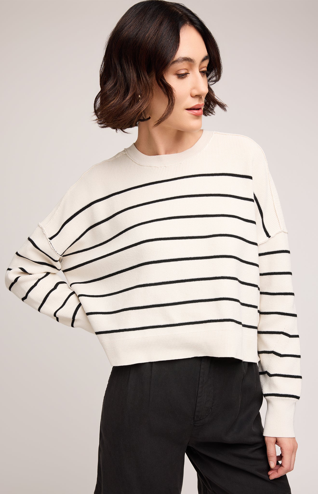The Echo sweater is made of a super soft yarn in a half cardigan stitch. Features include exposed seam detailing and side slits for an effortless look.