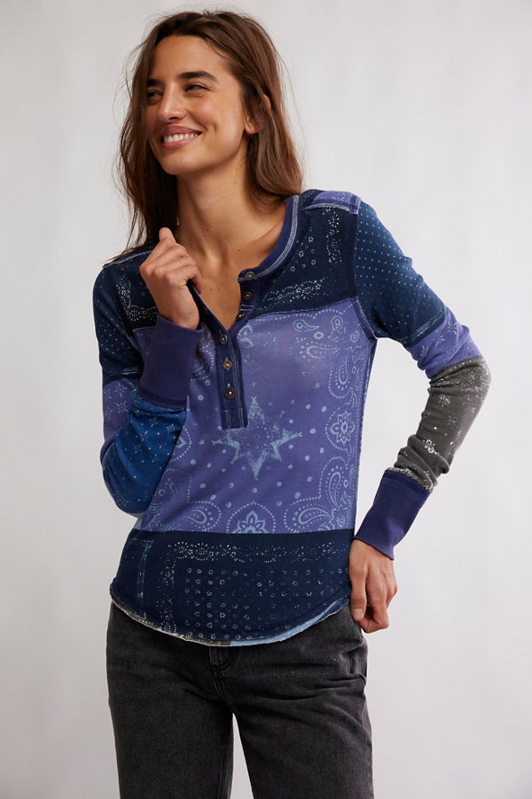 Us to our core–this so-special long sleeve from We The Free is featured in a comfy jersey fabrication and printed paneled design with a classic henley neckline and our signature elongated cuffs.