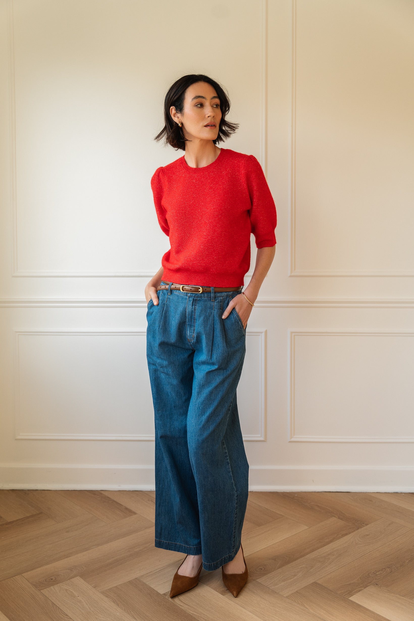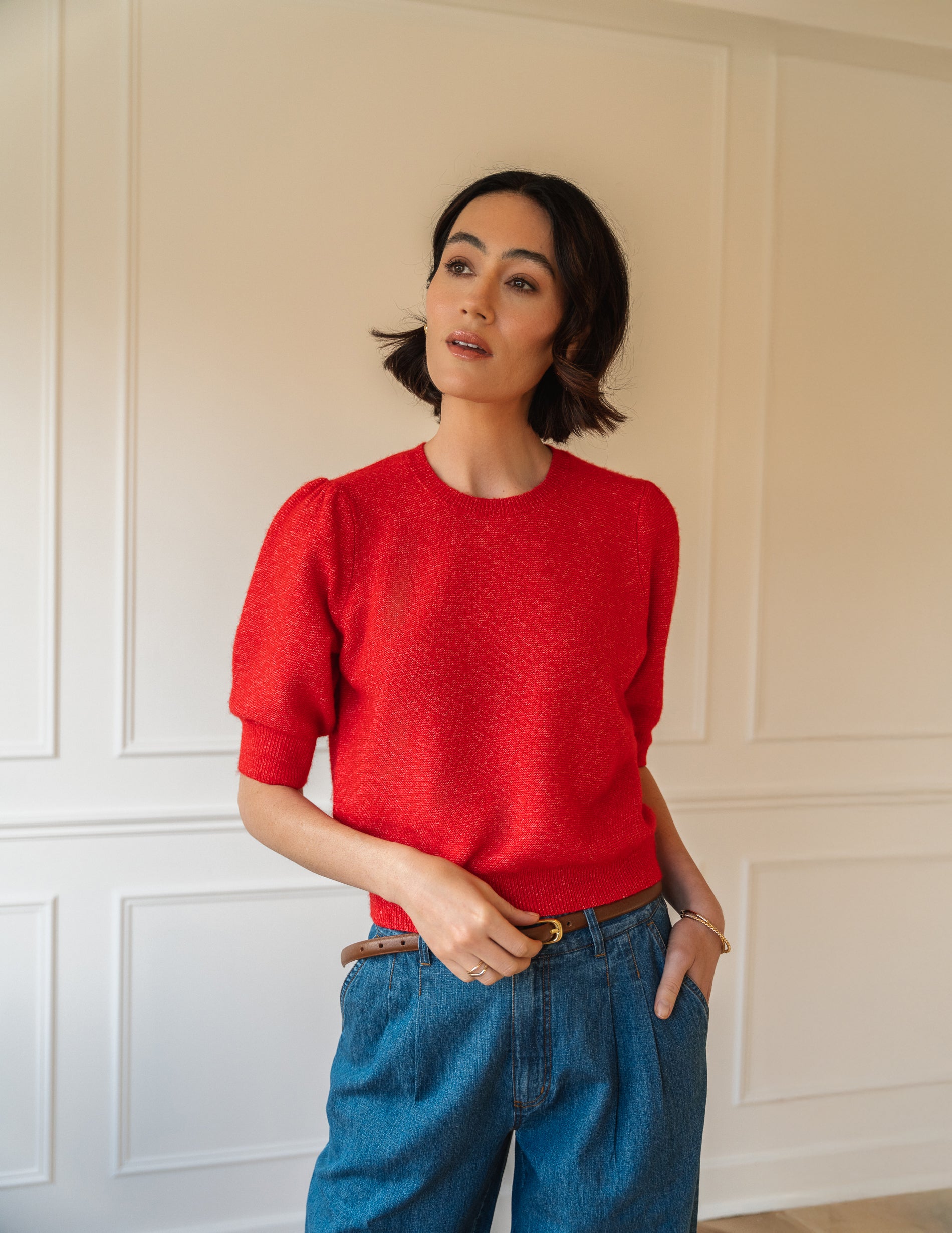 The Marisol is made of a soft, brushed yarn in a textured horizontal knit pattern. Features include a crew neckline and puff sleeves for an effortlessly feminine feel.