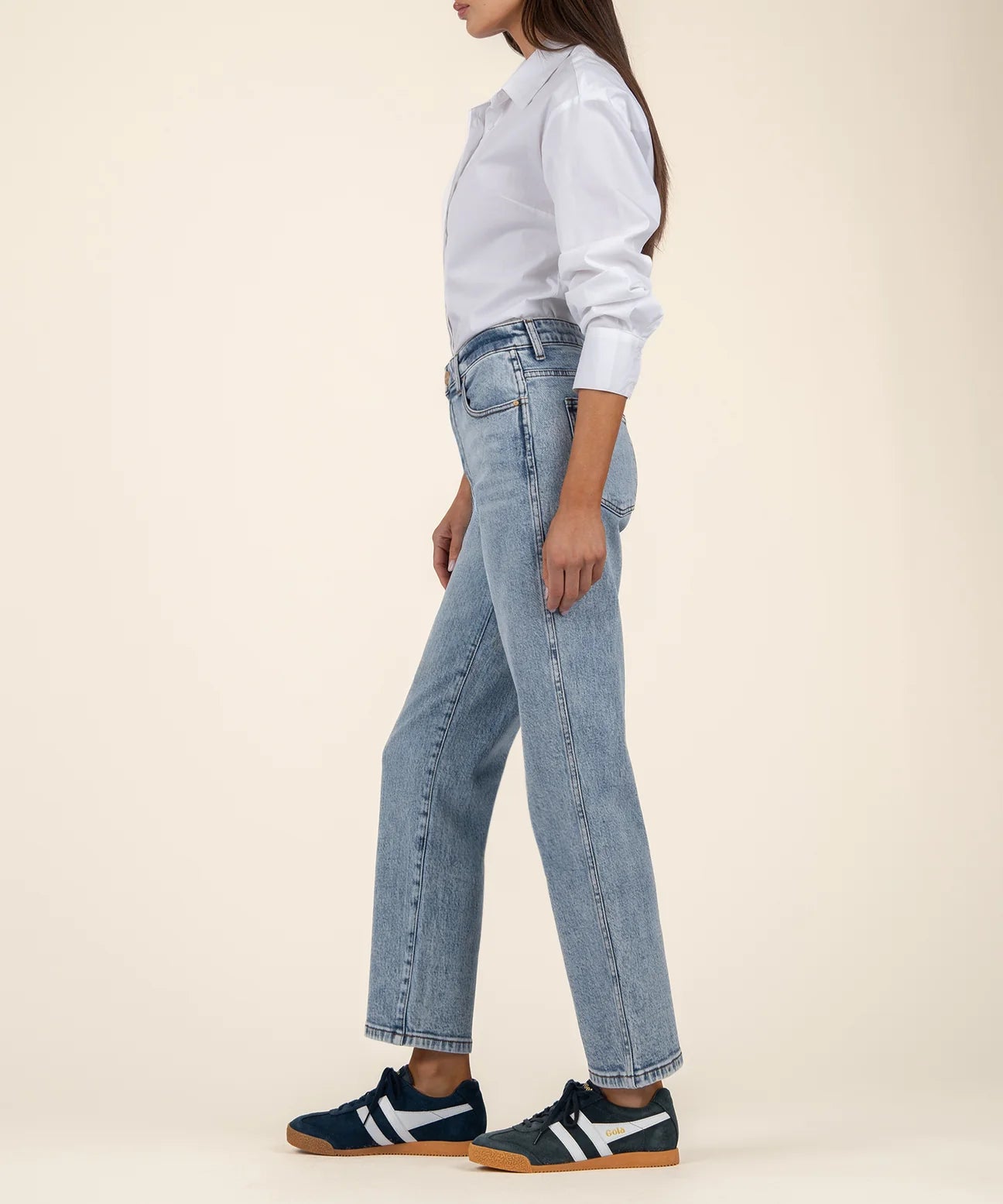 - These jeans are the perfect blend of comfort and classic style. Featuring a high rise and straight leg cut, they offer a flattering fit that’s both chic and comfortable. Crafted in a timeless vintage wash, these jeans boast a worn-in, effortlessly cool look that pairs seamlessly with any wardrobe.