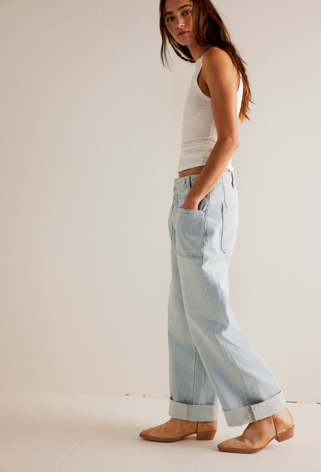Features: Zip fly and button closure, seamed pouch pockets, yoking for added shape, button detailing at the waistband, cuffed hemlines