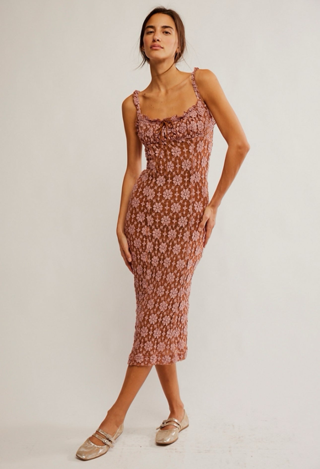 Just as effortless as it is essential, this timeless midi dress is featured in a fitted, pencil-style silhouette with floral lace embroidery throughout and staple square neckline for the perfect femme finishing touch.