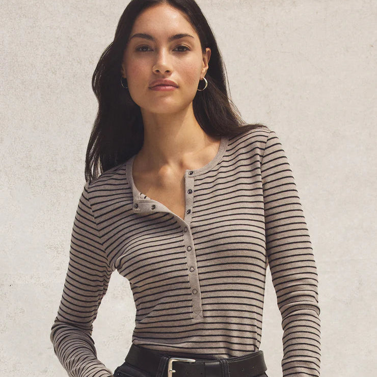 A fresh twist on a favorite silhouette. This striped henley is made from a lightweight cotton modal rib with a close-to-the-body fit, soft stretch, and a snap-front neckline that makes styling effortless.